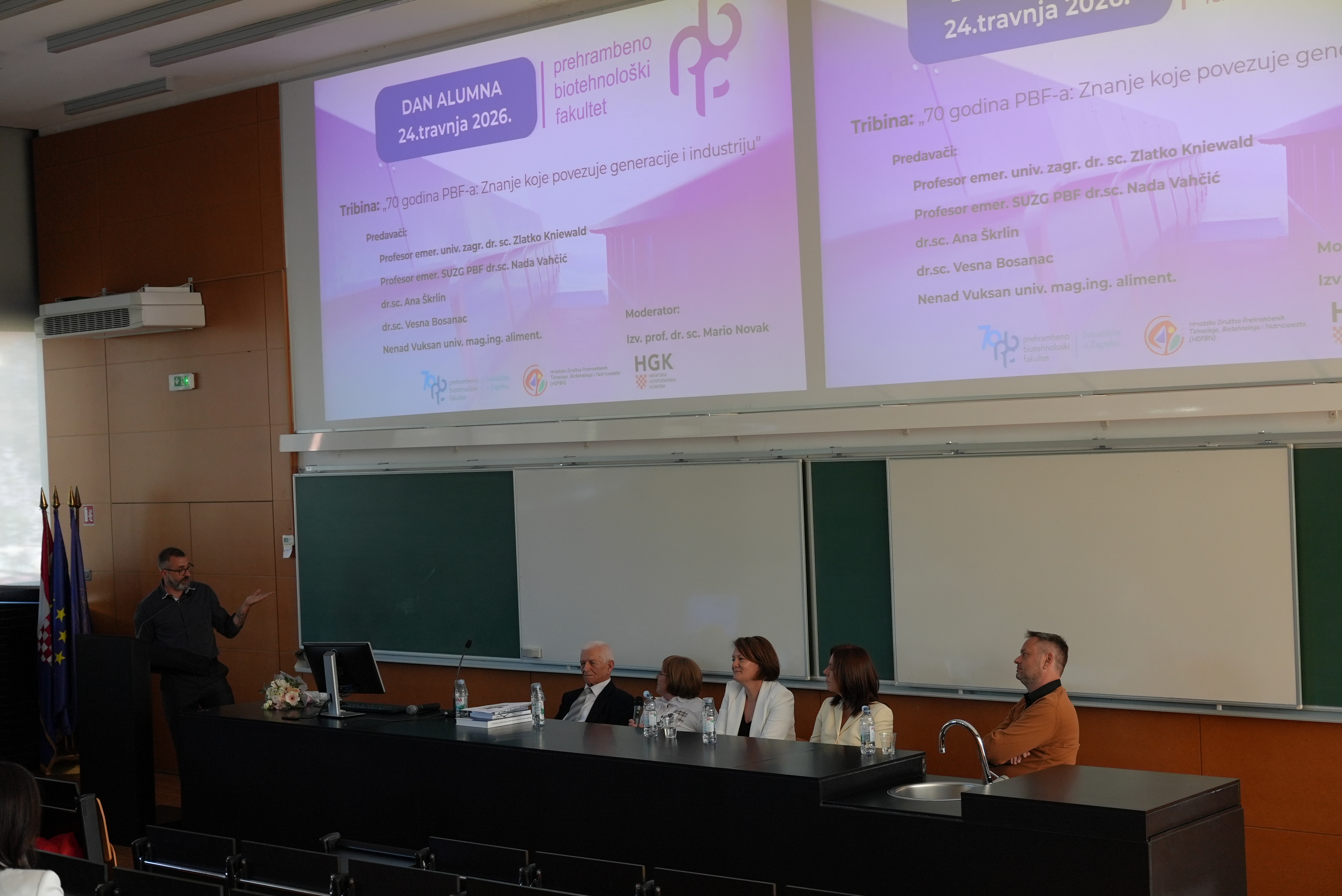 Središnja tribina, koju je moderirao izv. prof. dr. sc. Mario Novak, okupila je predstavnike akademske zajednice i industrije. Raspravu je otvorio prof. emer. dr. sc. Zlatko Kniewald, koji se prisutnima obratio kao prvi diplomant PBF-a, osvrnuvši se na početke Fakulteta i njegov razvoj.